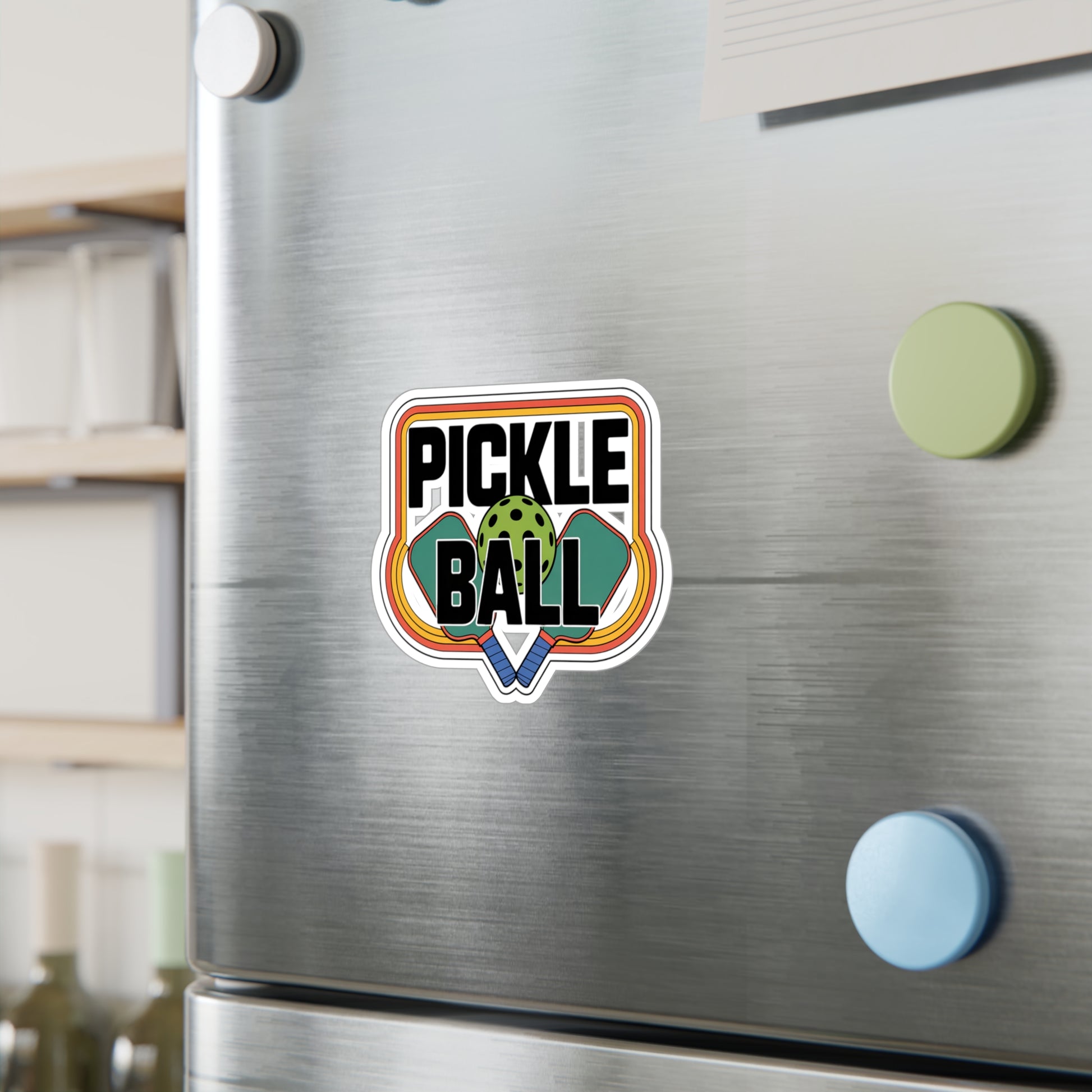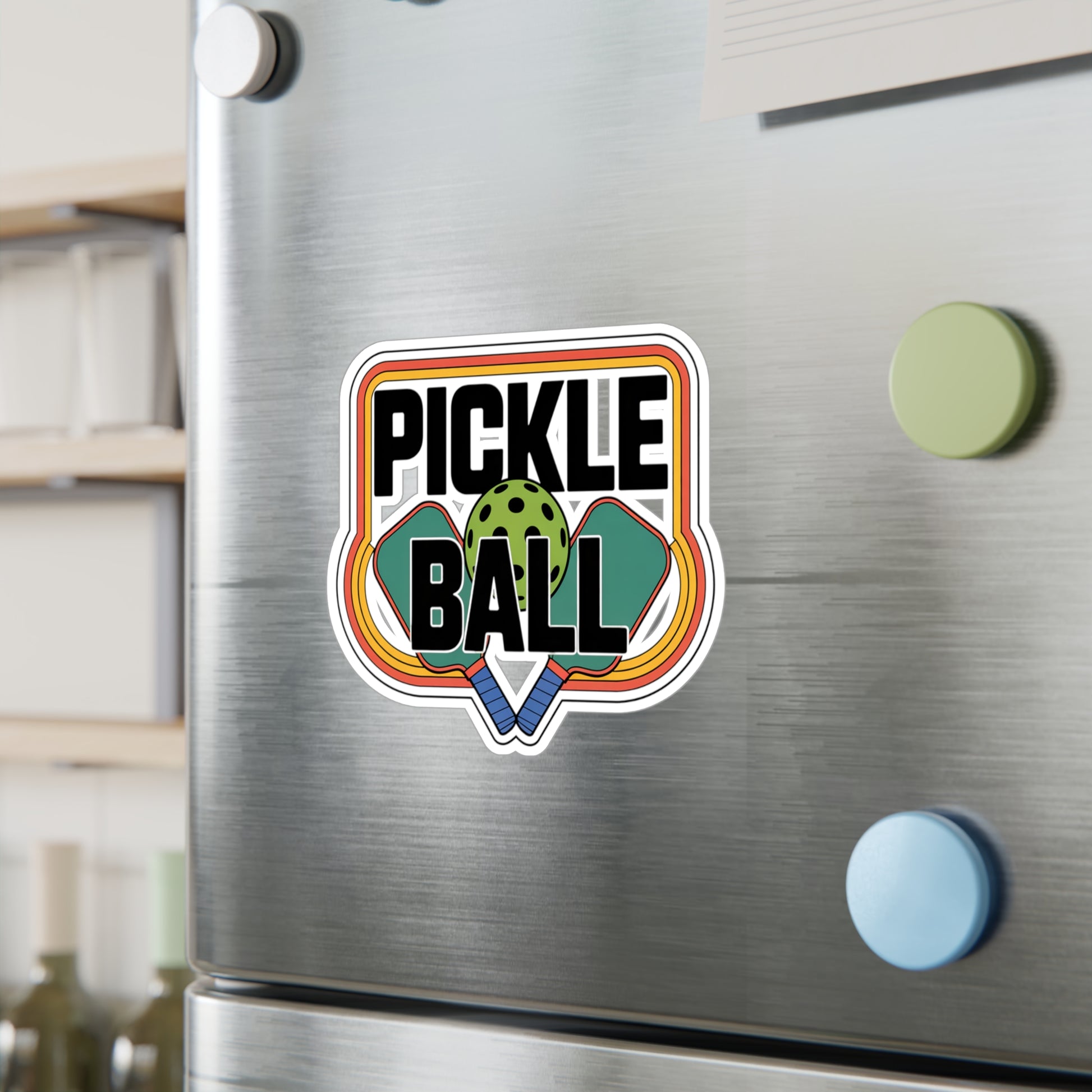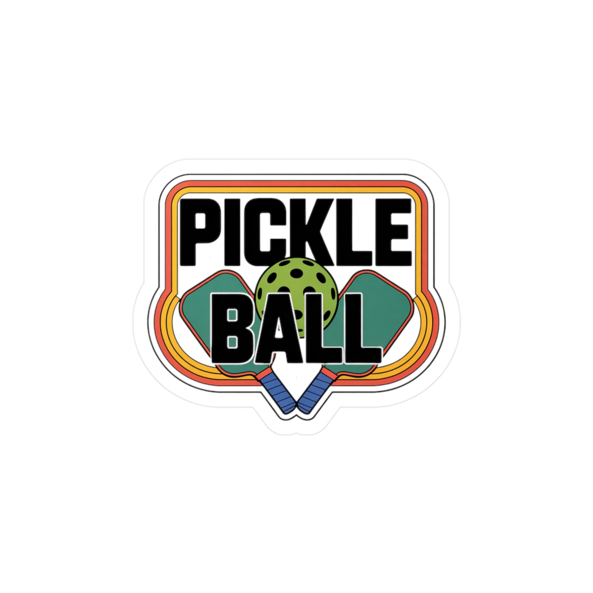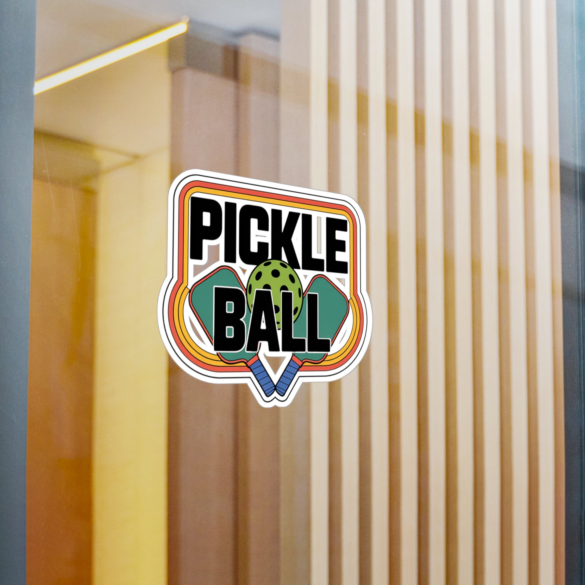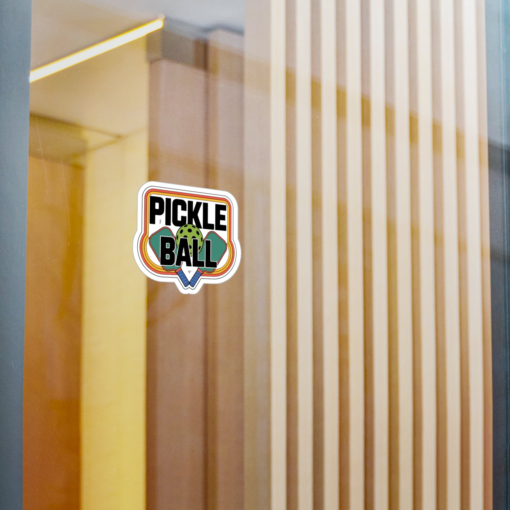 Bring retro vibes to your paddle case, water bottle, laptop, or wherever your dinks take you. This colorful kiss-cut vinyl sticker features bold block “PICKLEBALL” text, rainbow-lined borders, and two paddles crossed behind a classic green pickleball.